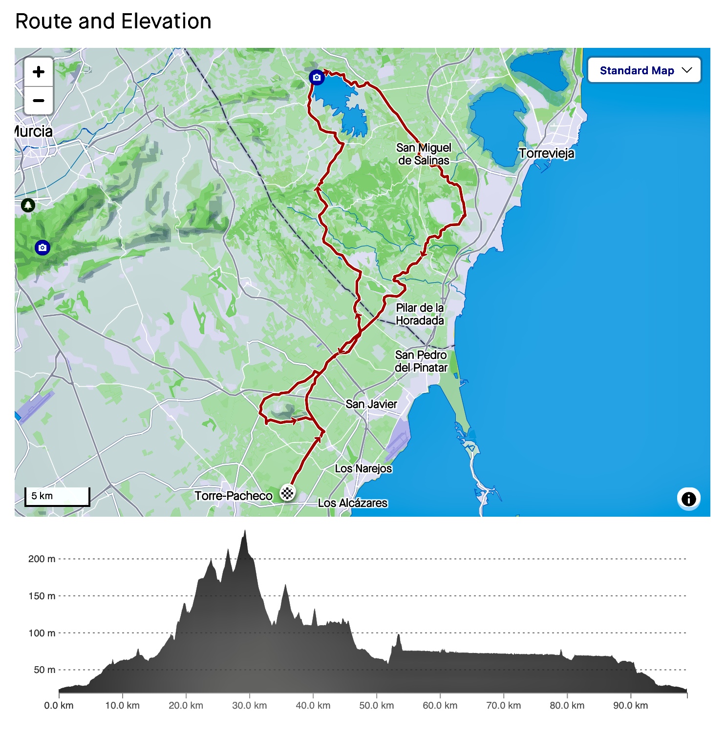 Need a route that’s longer than the classic coastal loops yet still leaves you daylight for the pool? The Vega Baja & Rebate Climb Challenge heads north from Mar Menor Golf Resort into the fertile Vega Baja orange belt, tackles the famed Rebate ascent (Murcia-Region gran-fondo staple), then loops back past San Javier for a fast, flat run-in. With ~600 m of gain across 99 km, it’s a perfect tempo day: enough climbing to test the legs, plenty of smooth kilometres to keep average speed high, and panoramic farmland views all the way.