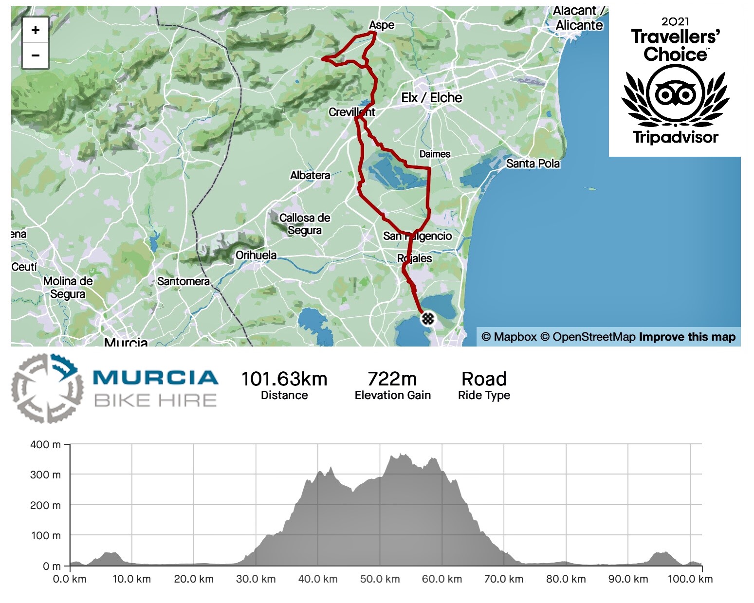 Level‑up your Aspe Ridge adventure on a freshly serviced, lightweight carbon road bike delivered straight to your accommodation by Murcia Bike Hire. Every rental includes dual bottle cages, saddle bag with spare tube & levers, mini‑pump, GPS mount, and on‑call local support. Reserve your bike, download the GPX, and roll out with confidence!